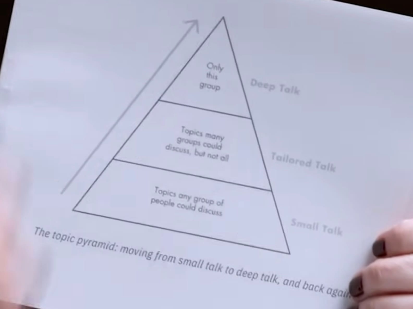 - Topics – Choose wisely. Don’t live in small talk forever, but don’t parachute into deep talk either. One idea is to prepare before conversations. This prep time could be as little as 10-30 seconds, or it could be much longer. Most people take the mistake of staying at small talk too long.