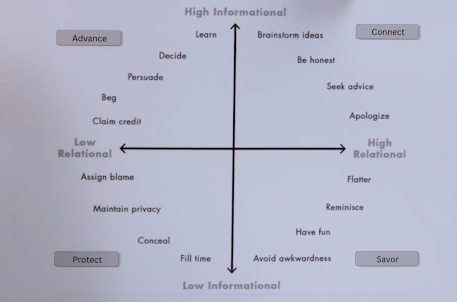 - Savor – High warmth, low information (bonding, reminiscing)